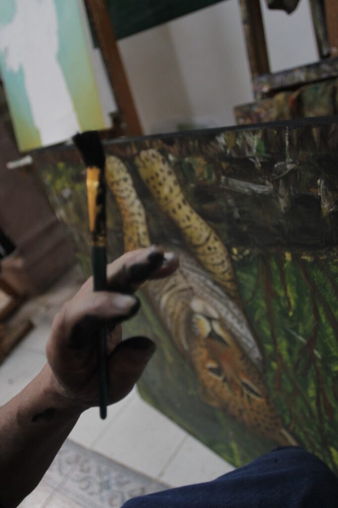 Pero ahora en el taller de pintura esa adrenalina ha dado paso a la quietud, hoy este hombre está en los últimos retoques de su Quijote que cabalga sobre un bello pasto verde y un cielo tan intenso y único como el de Zacatecas, mientras un jaguar sale de la frondosa selva y lo mira como esperando que lo termine, le lleve a casa u lo cuelgue en la pared.